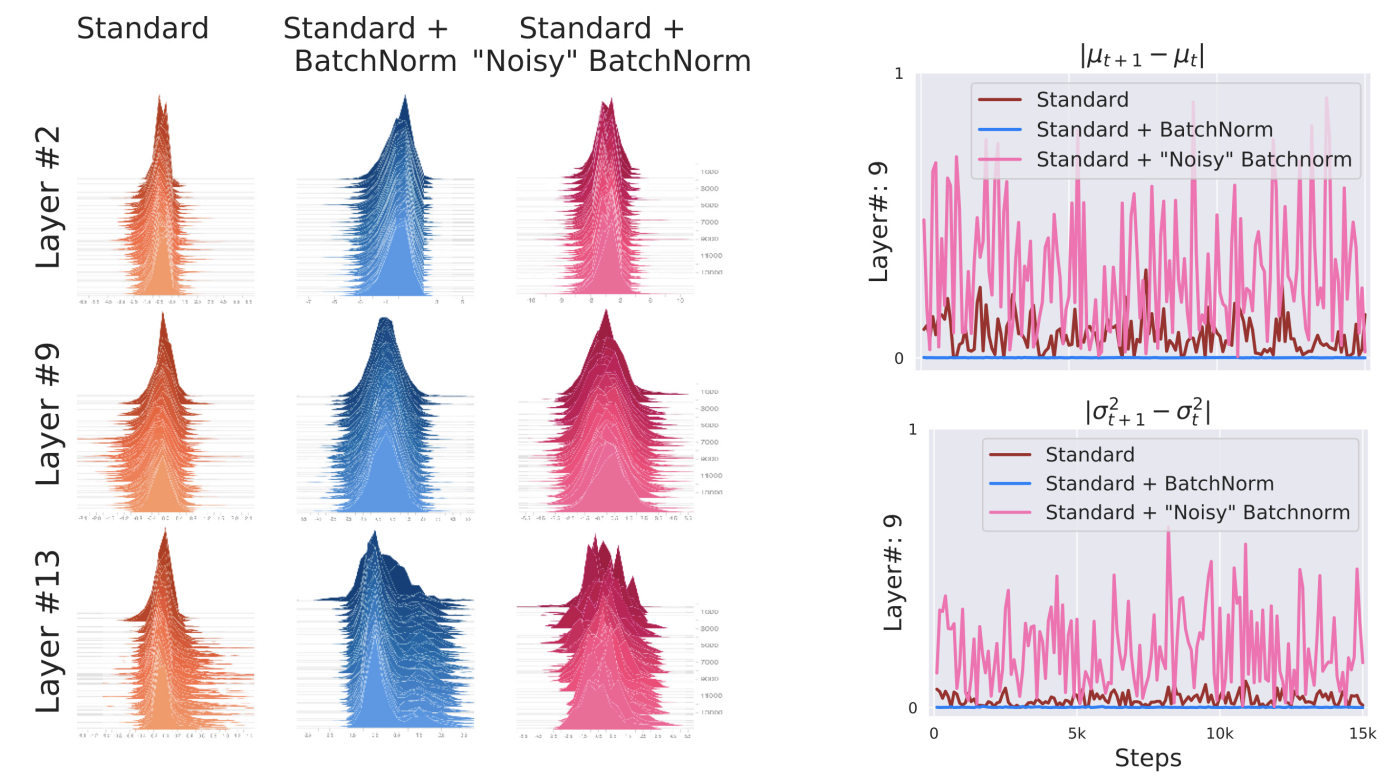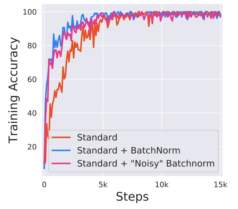 The theoretical backing for batchnorm’s optimization improvement is controversial. In STIM18, the authors argue it has nothing to do with internal covariate shift. They look at histograms of the inputs into a various layers and find that these histograms are fairly stable over the course of training iterations for both standard and batch normalized VGG NNs. The authors then create a “noisy” batchnorm NN where they add non-stationary Gaussian noise to the outputs of the batchnorm layer. While the histograms of this “noisy” batchnorm are noticeably less stable, it still converges faster than a standard NN.