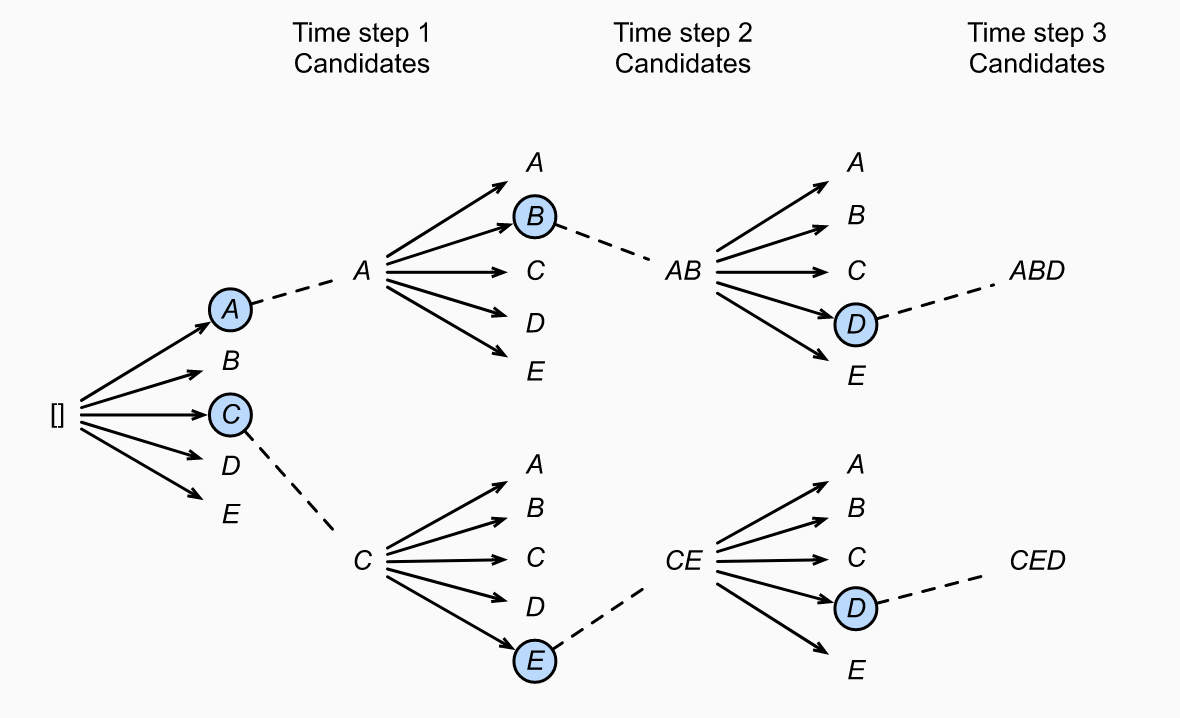 Beam search can optimize the tradeoff between accuracy and computational cost. There is a hyperparameter, , called beam size. At time step 1, we select the tokens with the highest conditional probs. At each following time step, we continue by selecting candidate output sequences with the highest conditional probs from the choices. The image below shows the process for , and . We start by picking and since for all , they maximize . In step 2, for all , we compute: