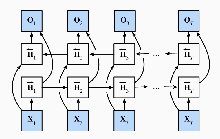 Most sequence learning problems, we want to model the next output given what we have seen so far. But there are problems where we may see the future and want to infer the past. For example, consider fill-in-the-blank tasks where longer-range context may be useful. In HMMs, one can combine forward and backward recursions to infer where form a sequence of outputs generated from hidden states . We can similarly learn from the future with bidirectional RNNs.