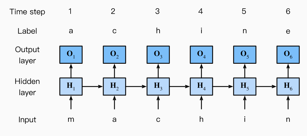 As a concrete example, consider the character RNN below where we want to predict the next token using current and past tokens. Consider a minibatch of size 1 with the sequence given by “machine.” In step 3, depends on “mac” and the cross-entropy loss will depend on the and the true char “h.” In practice, each token is a vector and batch size is greater than 1. So, the input is .