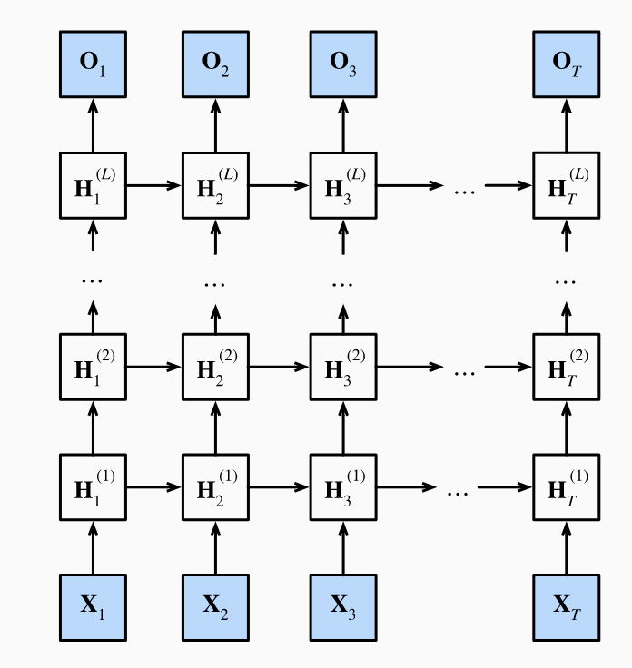 All the RNNs above have a single unidirectional hidden layer. GRUs and LSTMs specify how the inputs and latent variables interact within the hidden layer in different ways. Such specifications can be fairly arbitrary. But to create even more flexibility, we can stack several hidden layers on top of each other. Intuitively, we may think particular types of information is relevant at different levels of the stack. For example, maybe higher levels record macro-level trends, while the lower-levels keep track of shorter-term dynamics.