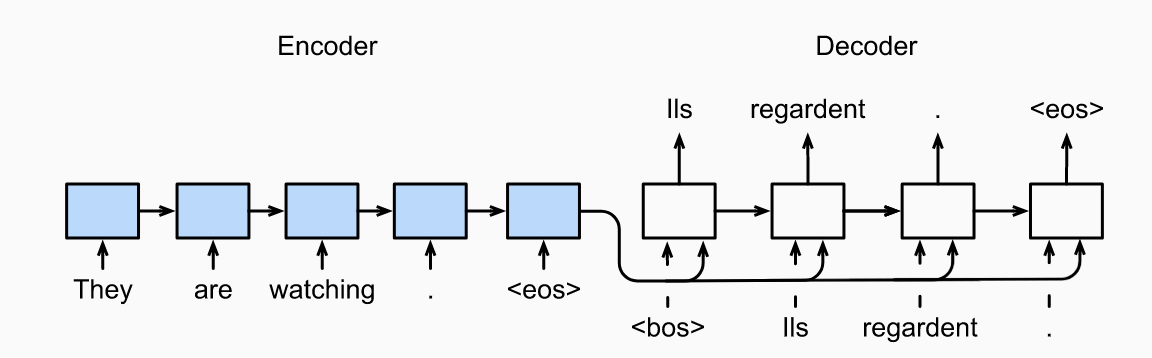 For machine translation, the encoder and decoders are typically RNNs. Info on the input sequence is encoded in the hidden state of the RNN encoder. A RNN decoder generates the output token by token based on the tokens it has seen/generated plus the hidden state from the RNN encoder. Below there are two special design decisions regarding the start of the RNN decoders. First, there is a <bos> token used as an input. Second, usually the final RNN encoder hidden state is used to initiate the hidden state of the RNN decoder. Here it is taken as an input in all time steps. Notice the RNN decoder can stop making predictions once it generates <eos>. Here the labels are just the original output sequence shifted by one token.