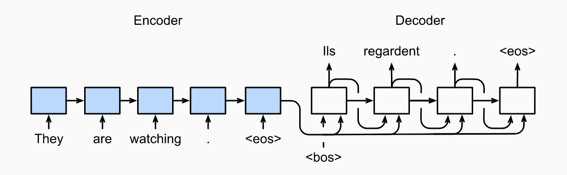 - In addition to the context, there is some flexibility on what to pass as decoder input during training. We could pass a concatenation <bos> and the original output sequence excluding the last token. This is called teacher forcing. Alternatively, we could also pass the predicted token from the last step as input to the current step. During test, we do not have access to the original output sequence, so we have to just past the last predicted token. The test time process is shown below.