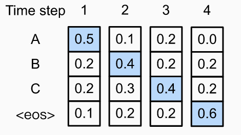 Over this full process, we have generated six candidate output sequences: , , , , and . After discarding the tails of sequences including and following <eos>, we choose the sequence which maximizes: