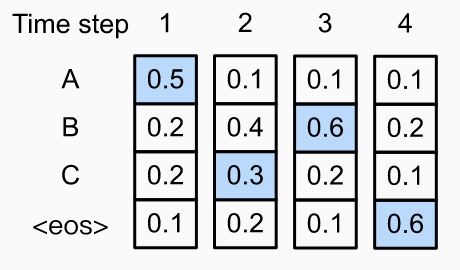 Once <eos> token is generated or the length of the output sequence reaches , the sequence is done. The optimal sequence is the sequence with the maximum value for . However, greedy search is not guaranteed to return this optimal sequence.