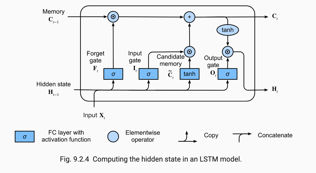 A memory cell records additional information about when to remember and when to ignore inputs in the hidden state. However, it is not passed to the output layer. It exists exclusively for state control. In it, we have the input gate (decides when to read data into the cell), forget gate (decides to reset the cell) and output gate (reads entries out from th cell).