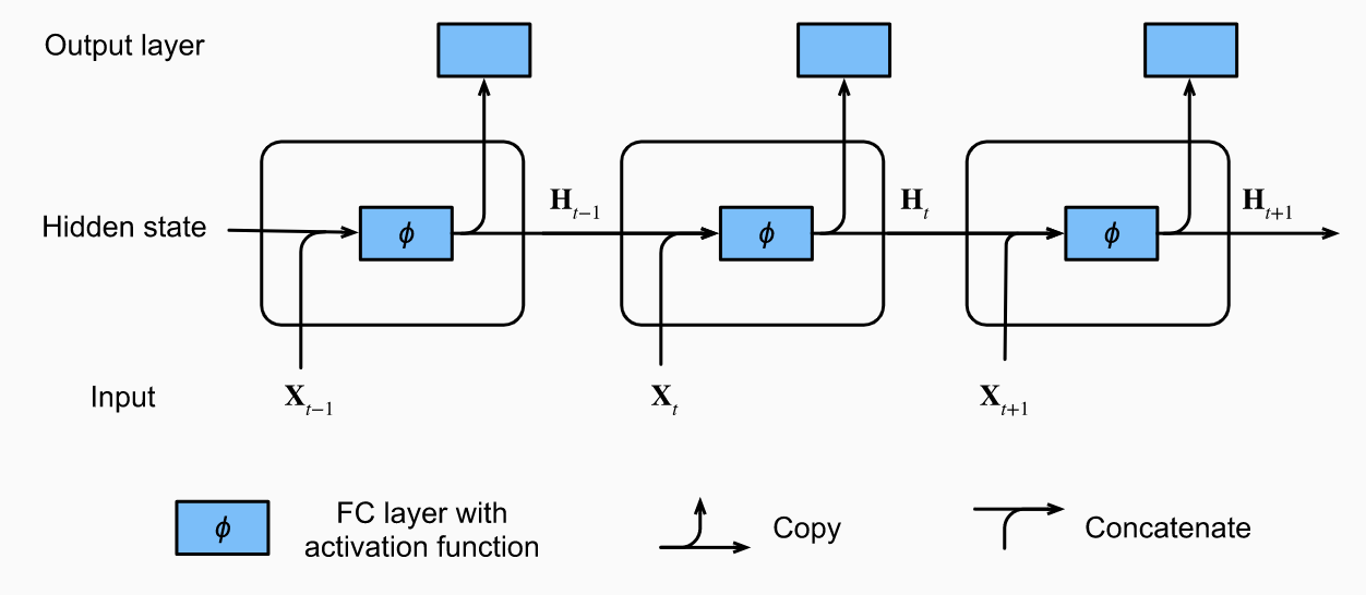Note that the weights and are constant across time steps. So, parameterization does not increase with . Note we can simplify computation of here by concatenating the matrices into and feeding them into a FC “hidden state” layer paramterized by . Then, we take and feed it into a FC “output” layer parameterized by to get .
