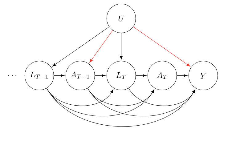 An alternative to G-computation is to use marginal structural models which posit a specific parametric form for and use IPW estimators of . Non-parametric G-computation always implies a particular form of a MSM. Hence if the models are correctly specified, both techniques should provide the same answers. So, as a robustness check one should always try to fit both to make sure the results are similar. If not, one of the models is incorrectly specified. In the parametric case, this equivalence does not hold. There is an issue with parametric G-computation known as the “null paradox”: there may be no setting for one’s parametric models which accommodate the case where the outcome is conditionally dependent on past treatment but has no effect. Hence if you think you are in a regime where the treatment has no effect and non-parametric models seem infeasible (i.e. you have a small or very noisy sample), you should use MSMs. Finally, there are doubly-robust MSM approaches which may be useful in case you are worried about model specification or think you can model propensity scores well.
