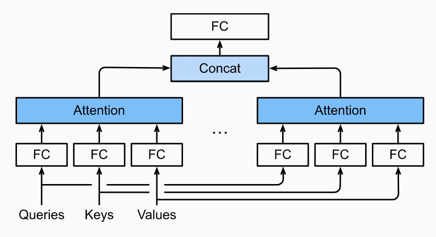 Given some set of queries/keys/values, it is possible we want our model to combine different types of attentions. For example, maybe we want to capture shorter and longer range dependencies within a sequence. Instead of learning a single attention pooling, the queries/keys/values can be transformed with learned linear projections. These sets of queries/keys/values are then pushed into attention pooling in parallel. Finally, these attention pooling outputs are concatenated and pushed through a FC layer to get the final output. This is called multi-head attention.