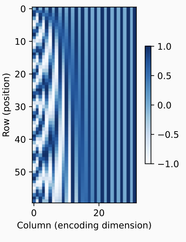 Here each row is a position in the sequence. Each column is a trig function of some frequency. Higher order columns are lower frequencies. The intuition is as follows. Think of 0-7 in binary: 000, 001, 010, 011, 100, 101, 110, 111. Notice the last bit alternates every number; it is high frequency. The middle bit alternates every two numbers; it is lower frequency. The firs tbit alternatives every four numbers; it is the lowest frequency. So, we are basically just converting each number to binary and using a continuous representation.