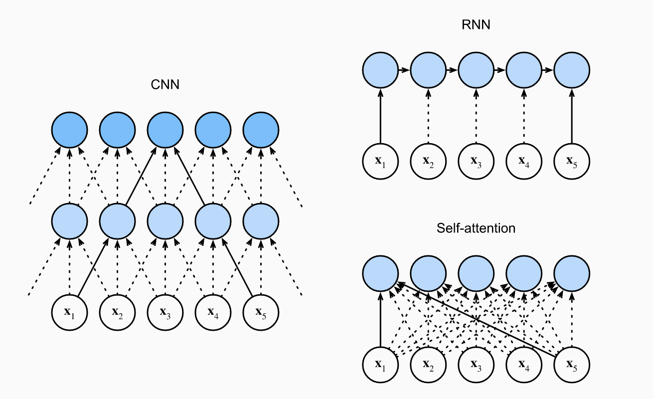 Hence both CNNs and self-attention can be parallelized. Self-attention has the shortest max path length, but quadratic compute complexity with regards to makes it slow for long sequences.