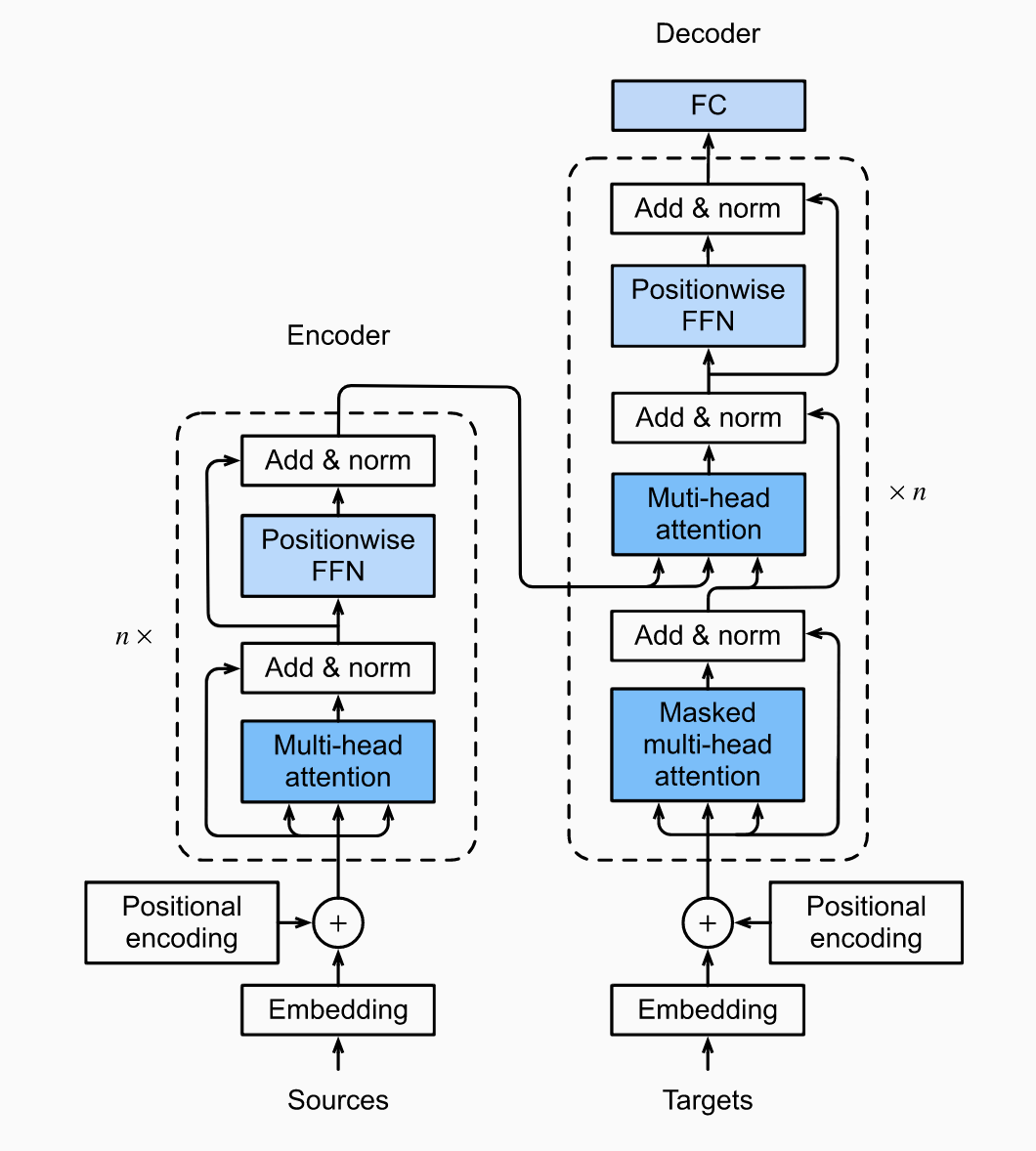 An transformer architecture is below. It is an encoder-decoder architecture but either one can be used individually. The source/target embeddings go through positional encoding before being pushed through the individual stacks.